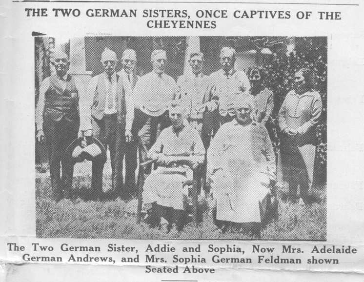 The information here is from the 1998 book The Moccasin Speaks-Living as Captives of the Dog Soldiers, compiled by the late Arlene Feldman Jauken, great granddaughter of Sophia German Feldman. Her extensive research into family documents, period correspondence, and conversations with her great-grandmother weave a spellbinding narrative of the German family’s ordeal. Mrs. Jauken has done amazing research of all the actors of the Red River War- the Indian Chiefs, Army Colonels, and politicians. Her understanding of that time period is enlightening. She even met with Medicine Water’s great great grandson, forging a life long friendship in which each came to understand the others losses and shared each others grief. It is a remarkably useful reference for the Red River War. It is a spectacularly well written read of how the Sisters learned forgiveness, and met with the ancestors of their captors.